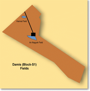 - بلوك داميس (S1) تقع في حوض السبعتين (مأرب – شبوة) بمساحة (1,156) كم2. وتقع غرب حقول الجنة المنتجة قطعة 5 وشرق حقول عياد قطعة 4 المنتجة.
