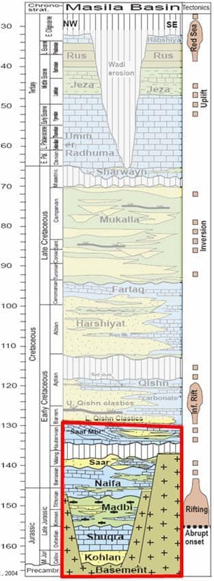 - وفي يوليو 2002، اكتشف العقبان 1 النفط في تكوين شقرة. أثناء الاختبار، تدفق النفط في البئر 35.9° API بمعدل 414 برميل في اليوم و0.065 ملم قدم مكعب في اليوم.