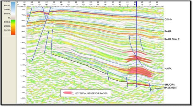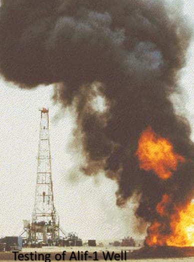 - وتم حفر بئر الألف-1 بعمق إجمالي قدره 4182 متراً في الطابق السفلي الجرانيتي. وفي الاختبار، تدفق البئر 4,162 برميلًا في اليوم من نفط 39.8 درجة API بين 1,752-1,757 مترًا و3,669 برميلًا في اليوم من زيت 44 درجة API بين 1,737-1,745 مترًا. كما أثبت البئر وجود كميات كبيرة من الغاز المصاحب.