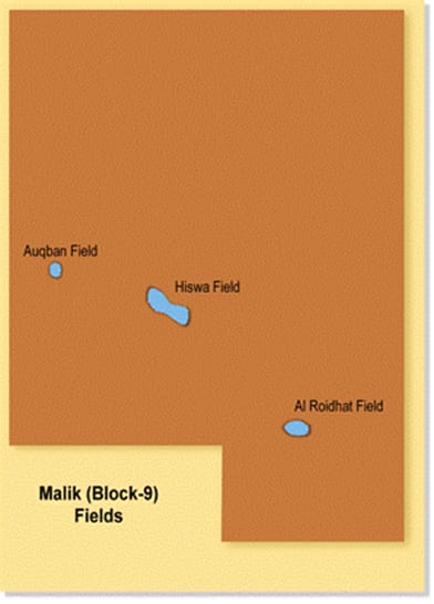 - مالك بلوك (9) تقع في الجزء الأوسط من اليمن على الحافة الغربية لحوض (سيئون – المسيلة) بمساحة (2,227) كم2. وتقع مباشرة غرب حقول المسيلة المنتجة رقم 14.