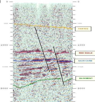 - وفي نهاية عام 1995، قامت شركة الغاز البريطانية بحفر بئر الحسوة-1، وكان النفط يتدفق من البئر بمعدل 163 برميلاً في اليوم من شركة سار/نايفة للكربونات.