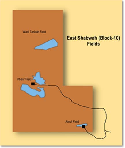 - ال شرق شبوة تم إعلان المنطقة تجاريًا في ديسمبر 1995 وبدأ المشغل خطة التطوير من أجل جلب حقول الخرير وعاطوف ووادي طريبة إلى الإنتاج بحلول عام 1997-1998.
