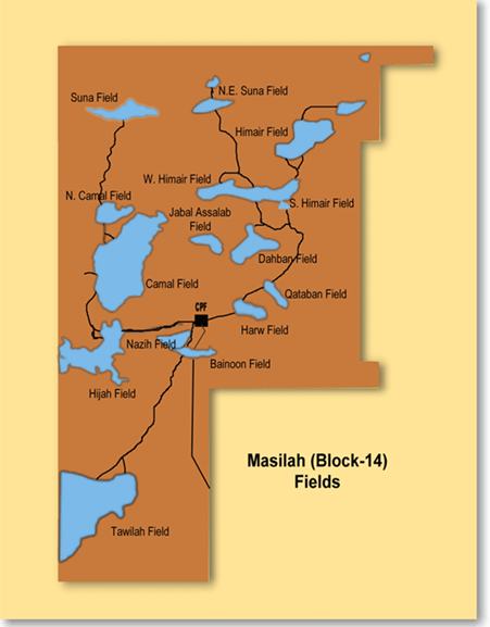 - وترتبط الحقول بخط أنابيب تصدير النفط الخام الرئيسي في المنطقة 14 عبر خط أنابيب بطول 46 كم و10 بوصات بطاقة 45 ألف برميل في اليوم، مما يسمح بنقل النفط الخام إلى محطة تصدير الشحر على خليج عدن.