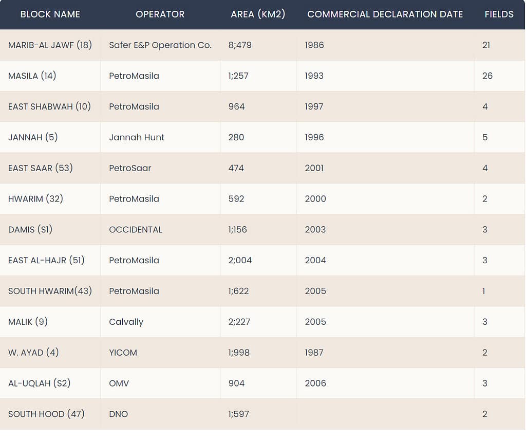 (13) blocks produce oil (and gas) of a (115) blocks. All 13 blocks produce from two sedimentary basins ; Sabatayn (Marib – Shabwah - Hajr) basin and Say'un – Masila basin.